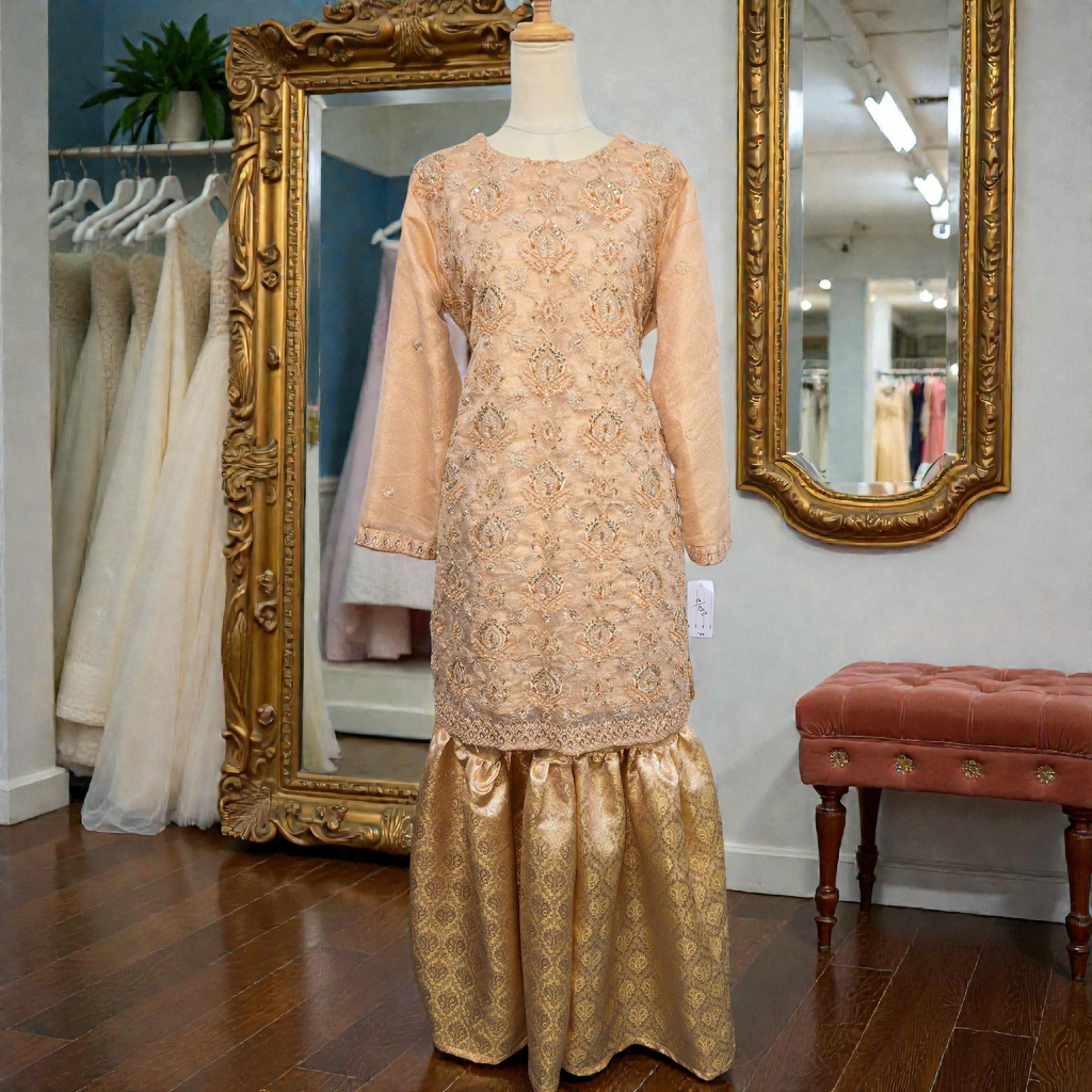 This pastel peach outfit features delicate all-over embroidery with subtle gold accents, creating a soft yet luxurious look. The straight-cut kurta is paired with a beautifully flared brocade gharara, adding rich texture and movement. Finished with fine detailing on the neckline and sleeves, this ensemble is perfect for Eid gatherings, festive evenings, or intimate celebrations—timeless, refined, and effortlessly elegant.