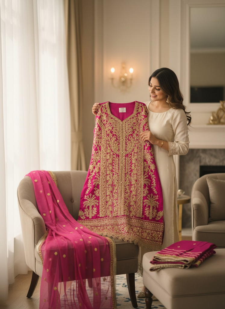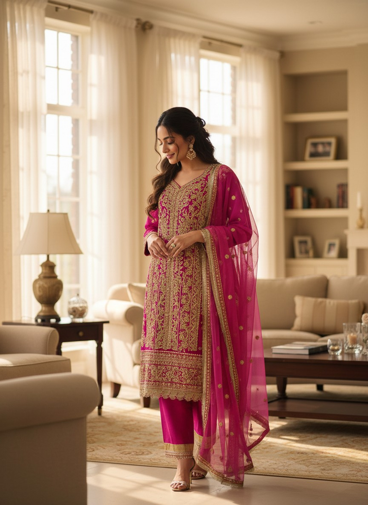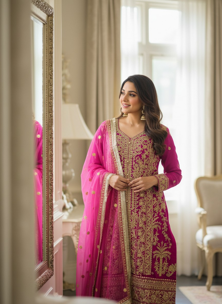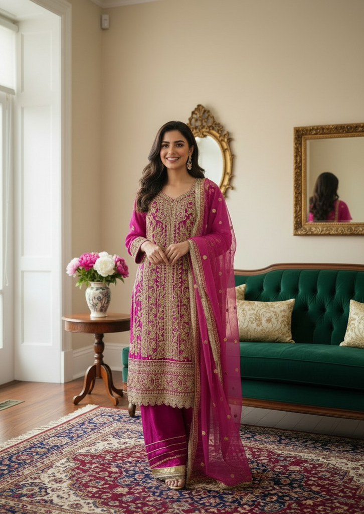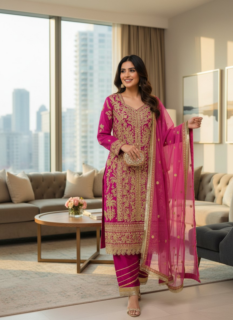 This stunning deep pink ensemble is a true statement of elegance, featuring heavy gold embroidery intricately crafted across the neckline, sleeves, and hem. The rich detailing gives a luxurious festive feel, while the beautifully bordered sheer dupatta adds softness and grace. Paired with matching trousers finished with delicate gold accents, this outfit is perfect for Eid, weddings, and special evening gatherings.