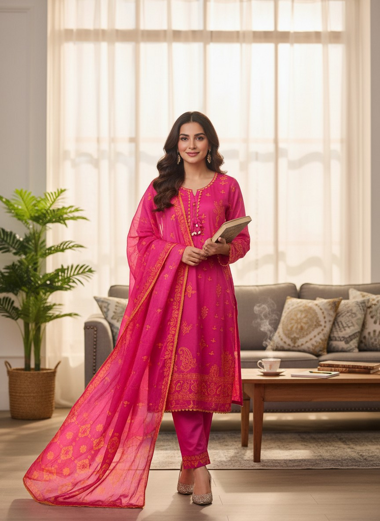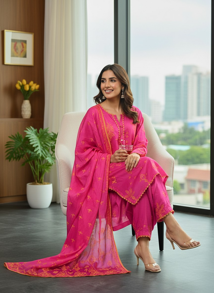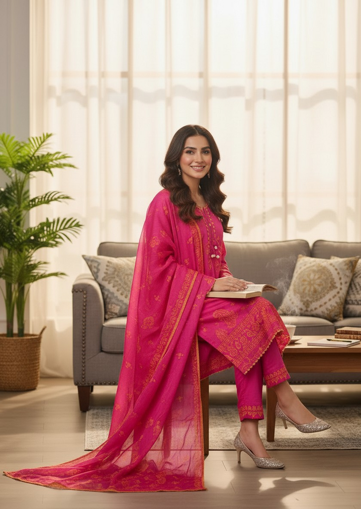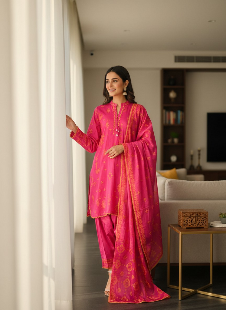 A vibrant pink outfit with subtle detailing, styled with a matching dupatta for a soft yet festive look.