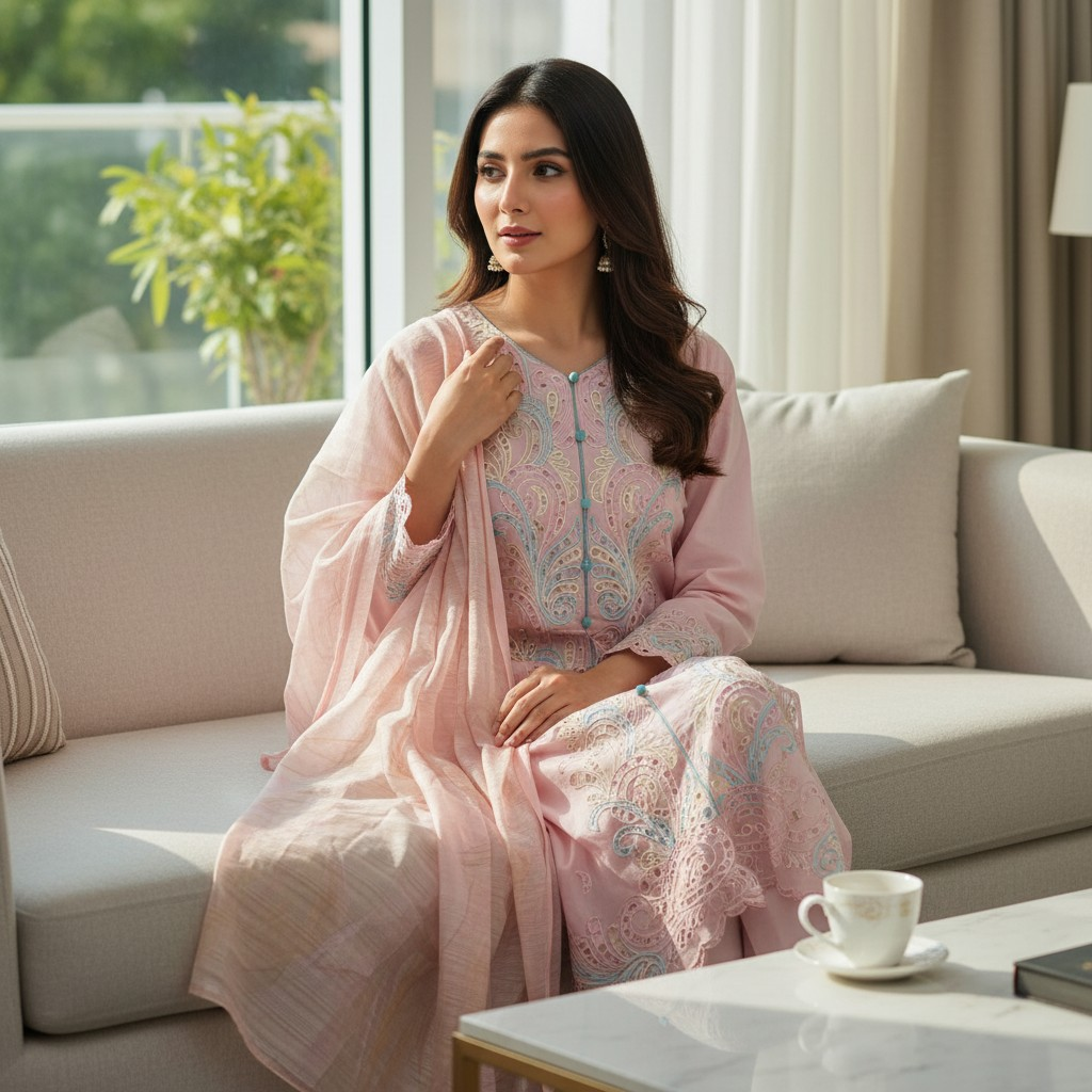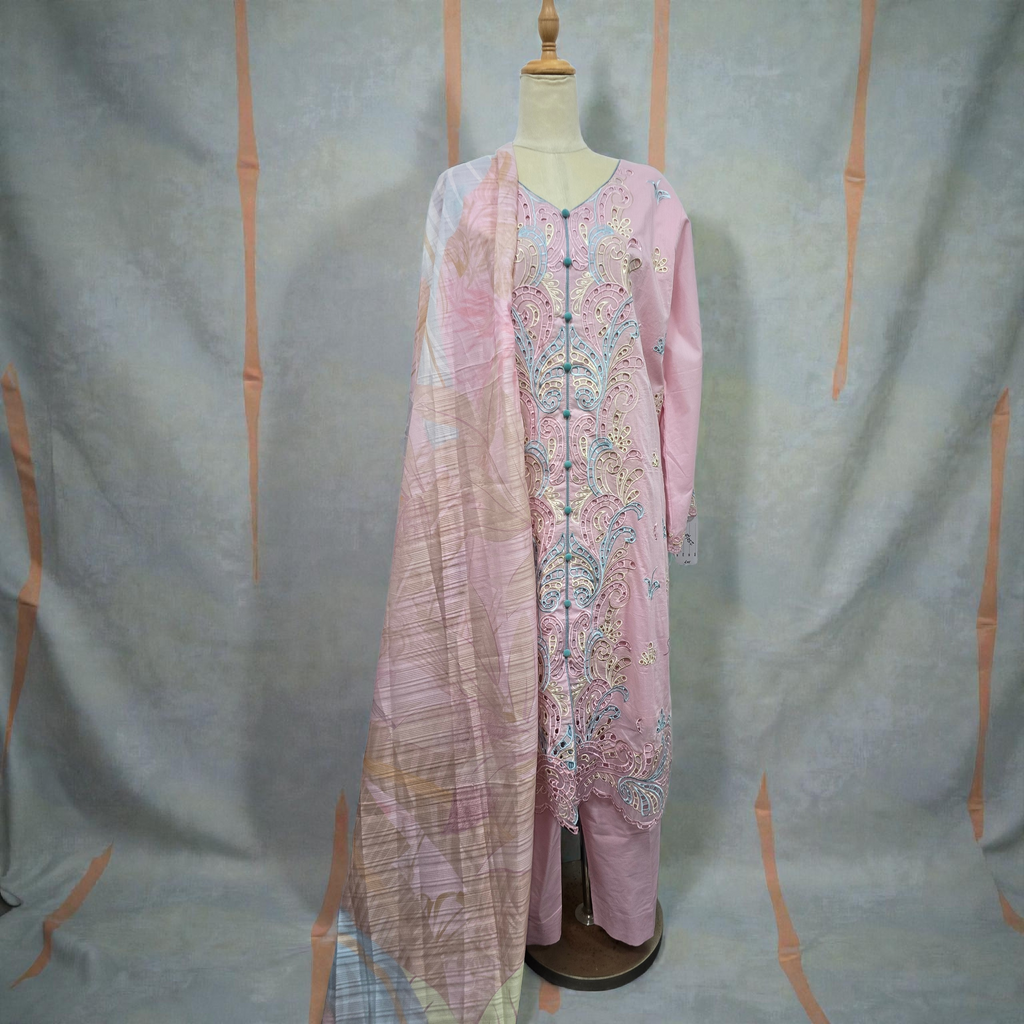 Step into timeless elegance with this graceful pastel pink 3-piece outfit, beautifully adorned with intricate embroidery on the front and sleeves. Paired with a soft, airy dupatta and matching trousers, this ensemble is perfect for festive gatherings, Eid celebrations, or sophisticated daytime wear. Soft Fabric | Premium Embroidery | Elegant Finish