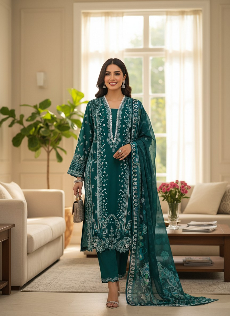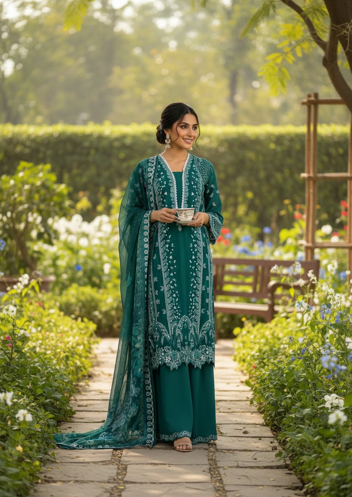 This deep emerald green suit is the definition of refined luxury. Intricate white embroidery beautifully frames the neckline and hem, giving it a regal finish. The coordinated dupatta with detailed borders enhances its sophistication. Ideal for evening get-togethers and festive occasions where elegance speaks louder than words