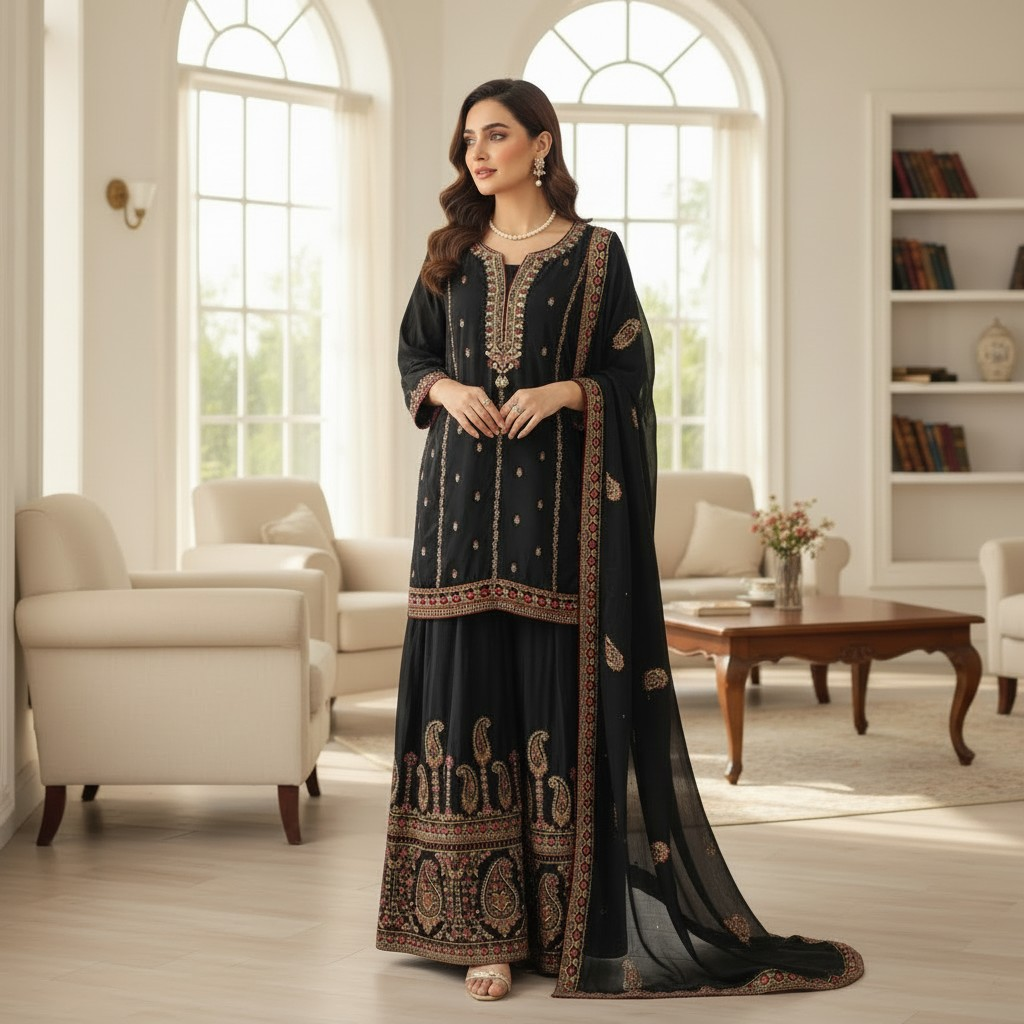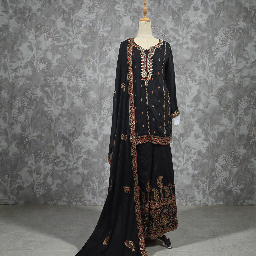 Elegant and timeless, this stunning black ensemble is designed for those who appreciate refined craftsmanship. The shirt features intricate hand embroidery on the neckline, sleeves, and borders, highlighted with delicate red and gold detailing that adds a regal touch. Paired with matching bottoms and a beautifully adorned dupatta with rich embroidered borders, this outfit flows gracefully and makes a statement of sophistication. Perfect for festive occasions, evening gatherings, or formal wear, it blends classic tradition with modern elegance.
