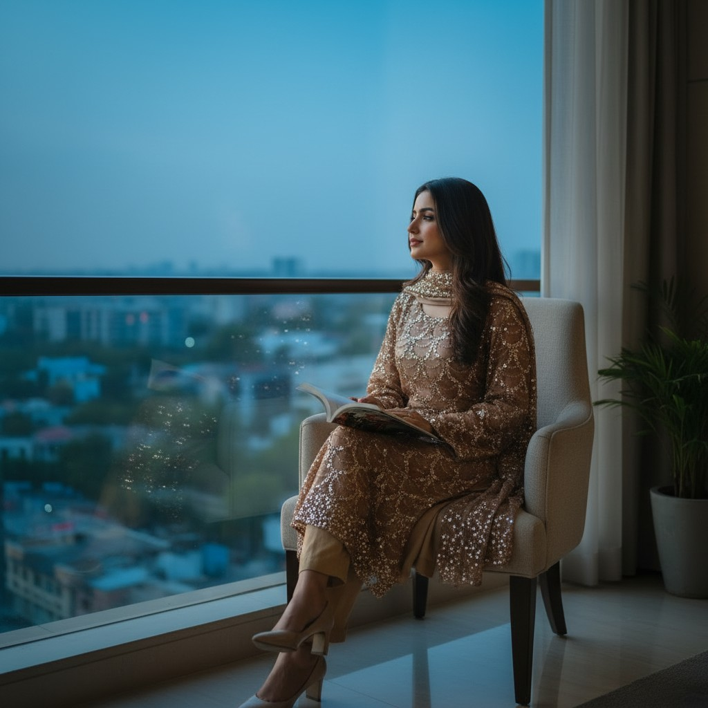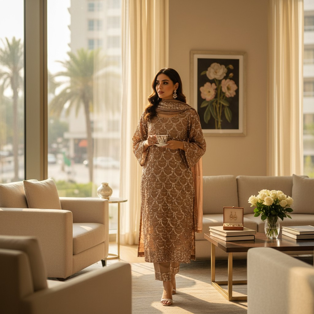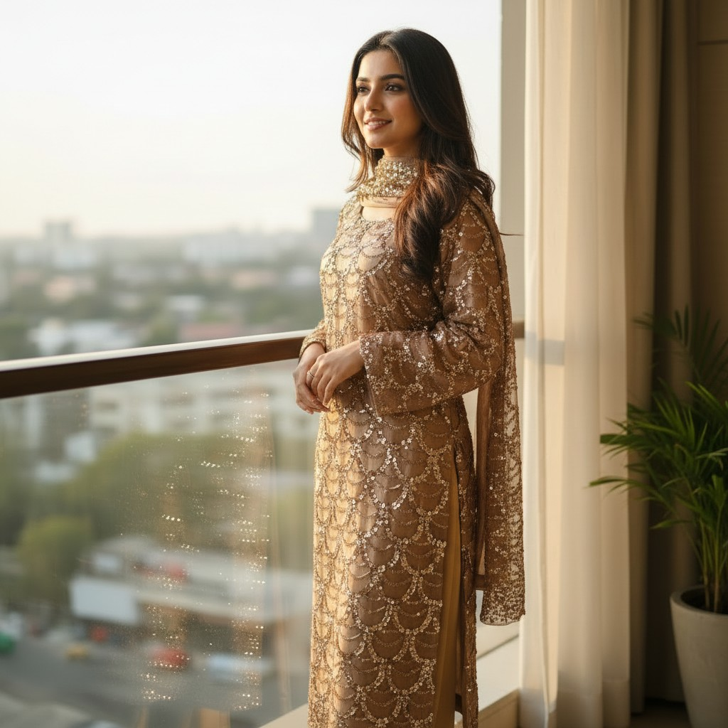 A graceful gold , paired with a flowy, textured bottom for effortless elegance. Perfect for festive gatherings, Eid, and refined evening wear. Subtle, classy, and beautifully versatile — a must-have for your wardrobe.