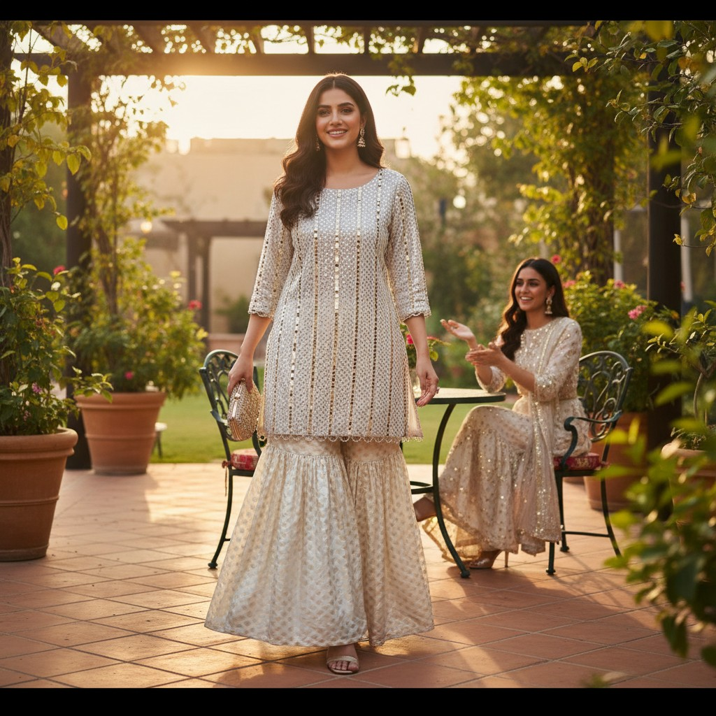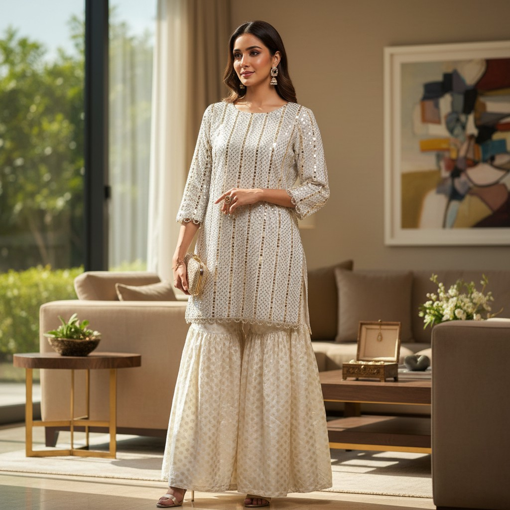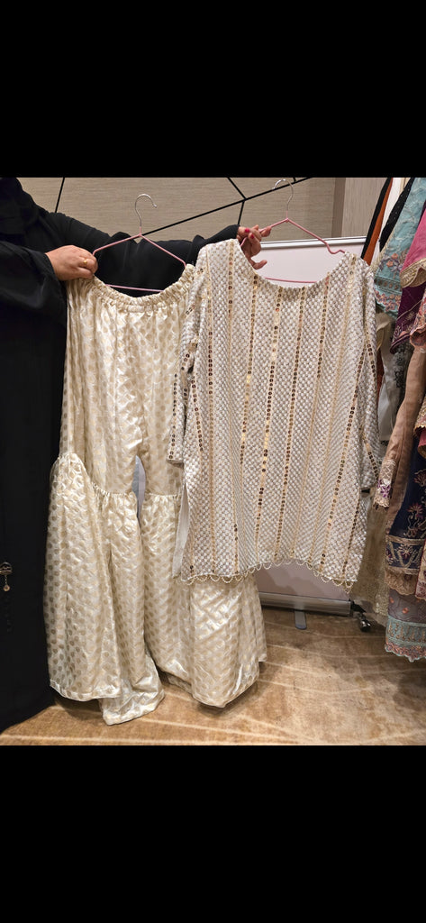 A graceful ivory-gold ensemble featuring intricate geometric embroidery with delicate sequin detailing, paired with a flowy, textured bottom for effortless elegance. Perfect for festive gatherings, Eid, and refined evening wear. Subtle, classy, and beautifully versatile — a must-have for your wardrobe.