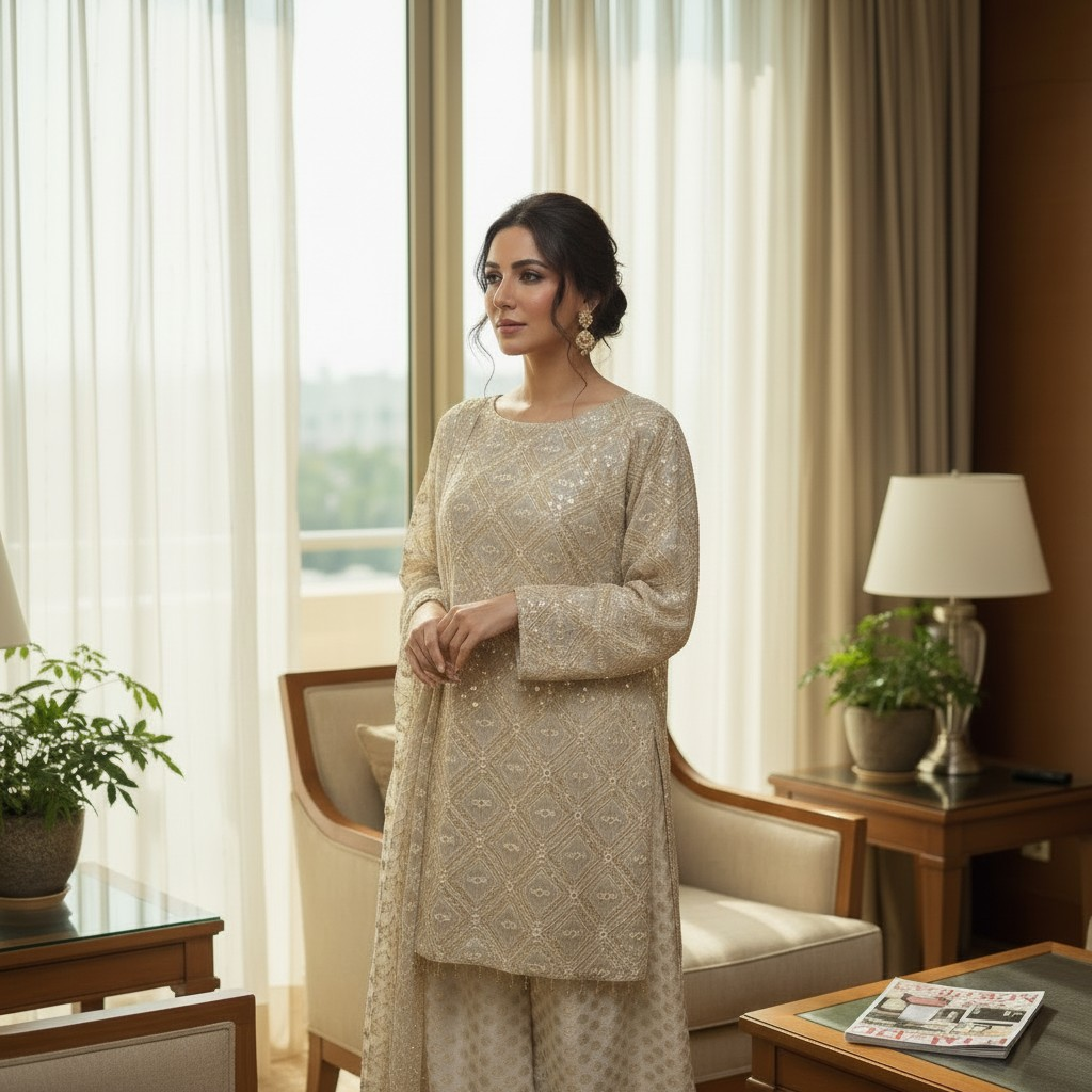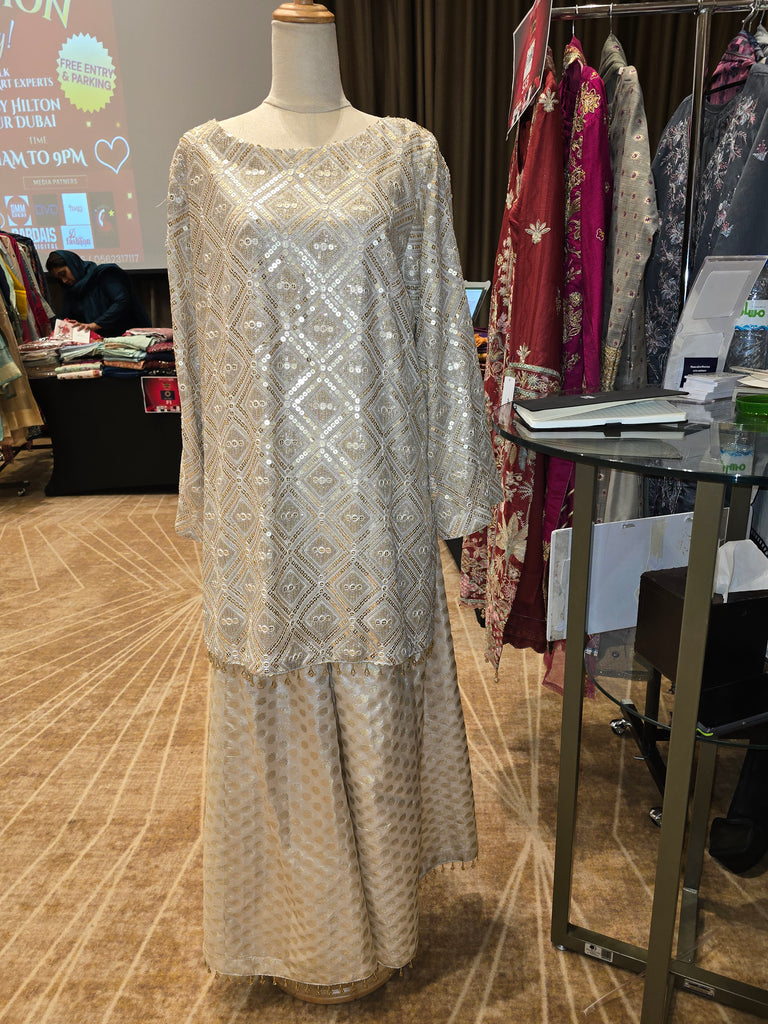 A graceful ivory-gold ensemble featuring intricate geometric embroidery with delicate sequin detailing, paired with a flowy, textured bottom for effortless elegance. Perfect for festive gatherings, Eid, and refined evening wear. Subtle, classy, and beautifully versatile — a must-have for your wardrobe.